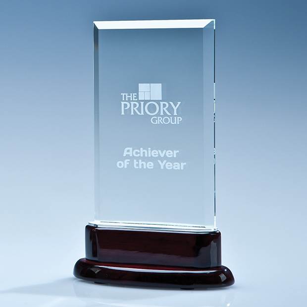 Simple yet very stylish, this elegant award perfectly combines 3 different materials. The 14.5cm crystal rectangle is bonded onto a brushed aluminium section and mounted onto a rosewood piano finish wood base. The rectangle has a large engraving area that can be personalised with any crest, logo or wording to create an award that is sure to take pride of place when put on display at home or at work.