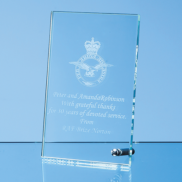 The stylish and versatile jade glass rectangle can be displayed vertically or horizontally with the aid of a chrome pin stand. There is a large area that can be printed or engraved with any crest, logo or wording to create an inexpensive recognition award or gift. The rectangle is available in 4 other sizes.