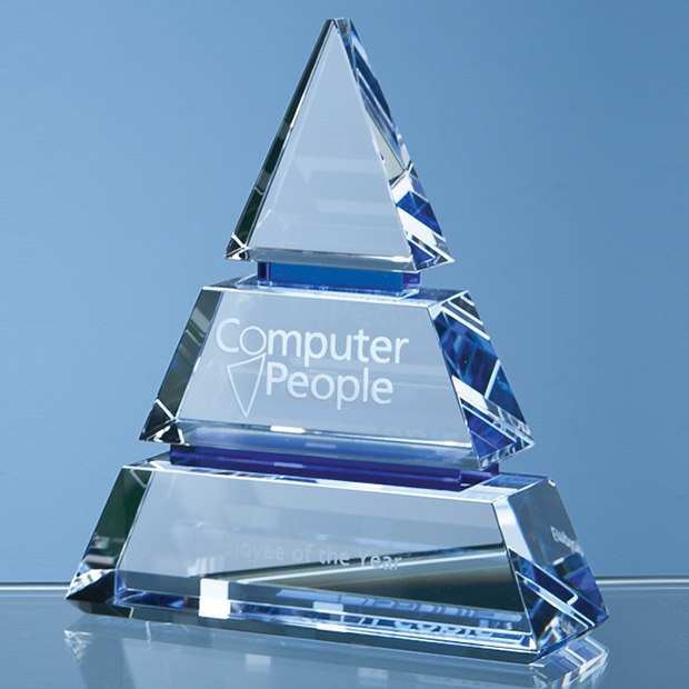 The exquisite 18.5cm Luxor Award is hand crafted out of perfectly clear optical crystal and Sapphire Blue crystal to create this unique pyramid shaped award. It can be personalised with any crest, logo or wording to create an award that is sure to take pride of place when put on display at home or at work. The award is an ideal recognition, achievement or incentive gift and it is supplied in a black foam lined presentation box.