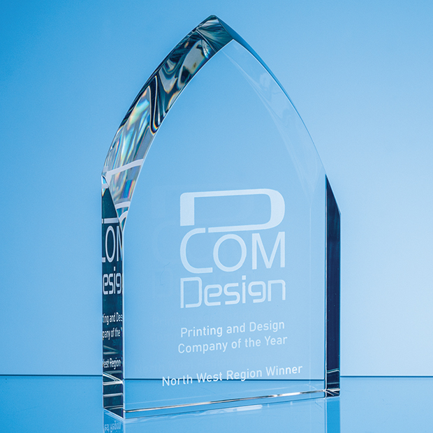 The 20cm Optical Crystal Arch Award provides a harmonious blend of timeless elegance and intricate craftsmanship that draws inspiration from the majestic arches of Gothic windows. The Arch can be decorated with sandblast engraving, sub surface engraving, full colour printing or a combination of all 3 to create an award that captures the essence of the moment and is sure to be treasured by the recipient. The award is supplied in a foam lined gift box.