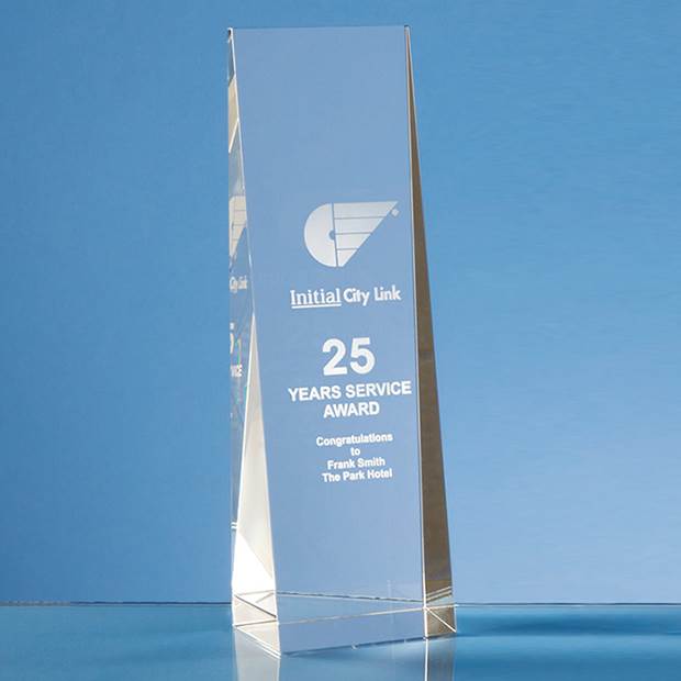 The wedge rectangle award is made out of clear optical crystal and is a stylish, contemporary design. The award is available in three sizes, 16.5cm, 19.5cm and 22cm and would be ideal for a 1st, 2nd and 3rd place award. There is a large engraving area that can be personalised with any logo, crest or wording.