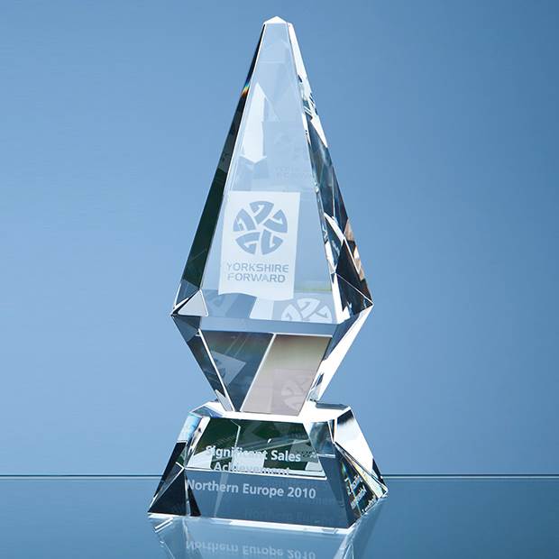 The stunning Glacier Award is hand crafted out of perfectly clear optical crystal. It is available in 3 sizes and can be personalised with any crest, logo or wording to create an award that is sure to take pride of place when put on display at home or at work. It is an ideal recognition, achievement or incentive gift and is supplied in a black foam lined presentation box.
