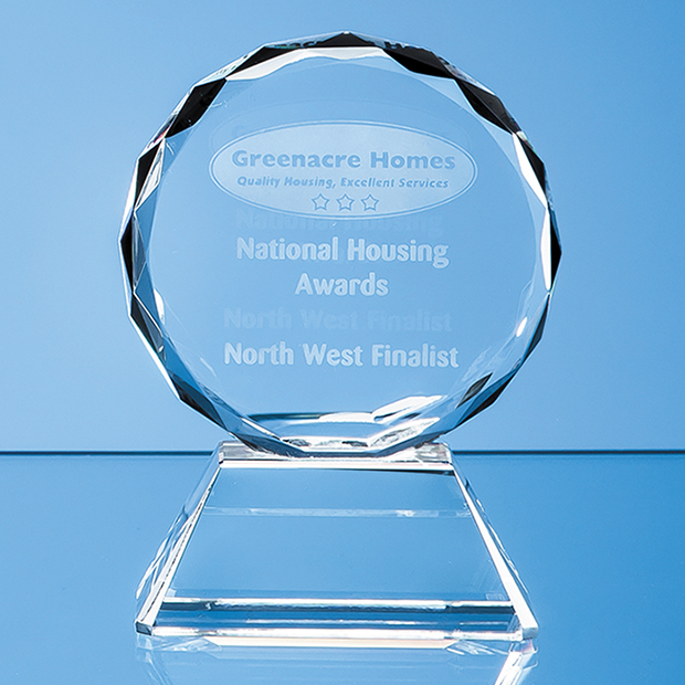 The stunning 11cm Facet Circle Award is hand crafted from the finest quality optical crystal. It can be personalised with any crest, logo or wording to create an award that is sure to take pride of place when put on display at home or at work. It is supplied in a black foam lined presentation box.
