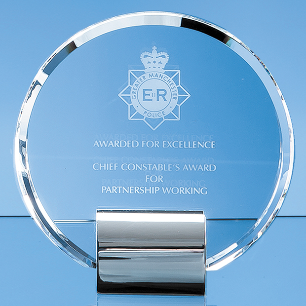 Elegant and very effective, the 14cm Circle Award is made out of perfectly clear optical crystal and mounted onto a chrome plated base to create an exquisite recognition, achievement or incentive gift. It can be personalised with any crest, logo or wording to create an award that is sure to take pride of place when put on display at home or at work. It is supplied in a black foam lined presentation box.