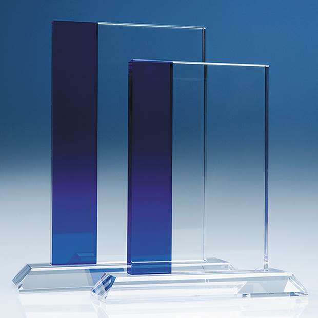 The stylish 23cm Blueline Rectable award perfectly combines clear optical crystal with a band of Sapphire Blue crystal. It is mounted onto a rectangular base to create an exquisite recognition, achievement or incentive gift. It can be personalised with any crest, logo or wording to create an award that is sure to take pride of place when put on display at home or at work. The award is supplied in a black foam lined presentation box.