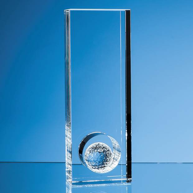 This golf award has definitely got the X factor A simple rectangular block shaped award in flawless optical crystal but with a twist nestled in a hole placed towards the bottom of the award is a crystal golf ball. Perfect to recognise golfing achievements such as a hole in one longest putt or drive. The award is available in two sizes - 17cm and 23cm shown. Each award can be used individually or choose one of each size for winner and runner-up prizes. With a generous area to engrave a crest company logo or message each award comes in its own foam lined presentation box.