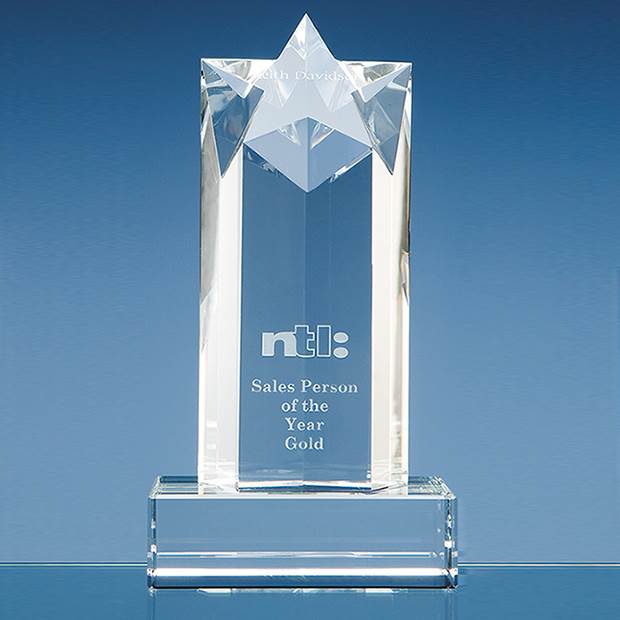 The Star Column awards are extremely impressive and an ideal recognition, achievement or incentive gift. They are hand crafted out of perfectly clear optical crystal and are available in 3 sizes. They can be personalised with any crest, logo or wording to create an award that is sure to take pride of place when put on display at home or at work. They are supplied in a black foam lined presentation box.
