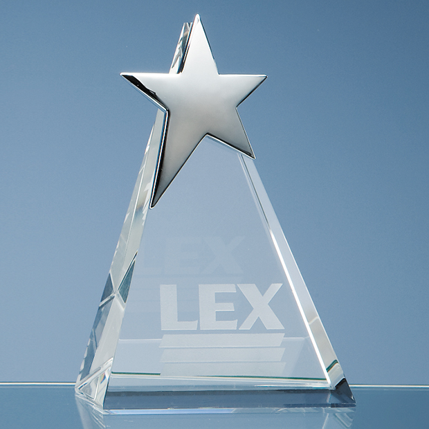 Stylish and modern looking, the 20cm award perfectly combines a hand crafted optical crystal triangle with a silver plated star to make an award well worth winning. The triangle can be personalised with any crest, logo or wording to create an award that is sure to take pride of place when put on display at home or at work. It is an ideal recognition, achievement or incentive gift and is supplied in a black foam lined presentation box.