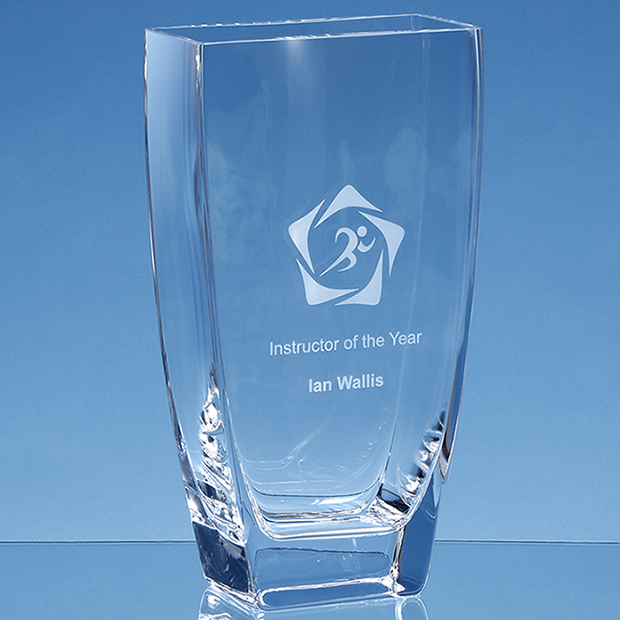 A wonderfully curved style with a stunning polished finish. This Handmade Rectangular Vase makes its own statement of elegance. It has a spacious area perfect for a crest logo or wording using either sandblast engraving or a spot colour print. There is also an option of adding a satin lined presentation box for a touch of class.