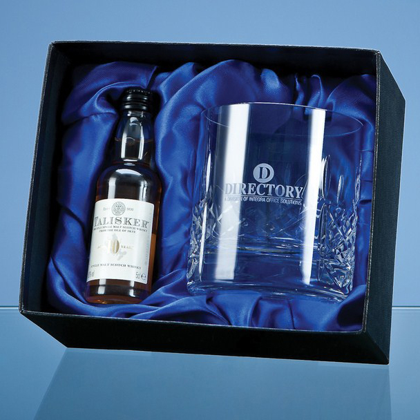 This satin lined presentation box will fit a miniature bottle along with a wine glass or high ball tumbler to create an attractive gift set.