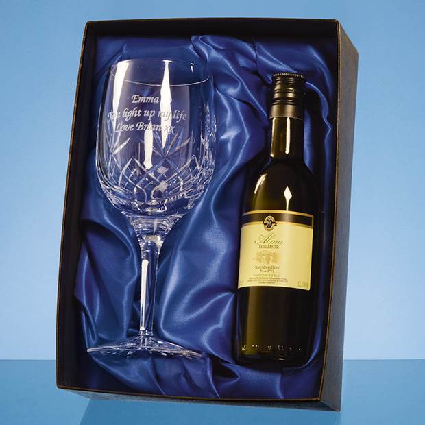 The Lead Crystal Goblet and White Wine set would be a great gift for a birthday or graduation. The goblet has diamond cut detail and an engraving area which can be personalised with any crest, logo or wording. This gift set is presented in a satin lined box and is sure to be treasured and enjoyed by the recipient.