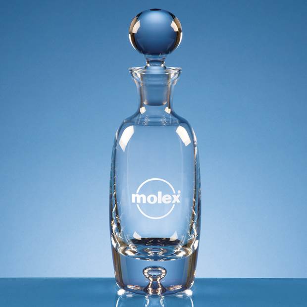 The handmade tall wine decanter has a bubble base and a spherical stopper. It has a large engraving area and can be personalised with any logo, crest or wording and is sure to take pride of place when displayed at home or at work.