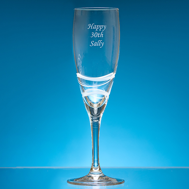 The lead crystal Verona champagne flute is elegant in design and modern in appearance with a contemporary wave pattern cut around the side of the flute. Despite the cutting there is still plenty of room to personalise the flute with any crest, logo or wording to create a gift that is sure to take pride of place when put on display at home or at work. Please note the cutting on the glass now has frosted cutting rather than polished cutting