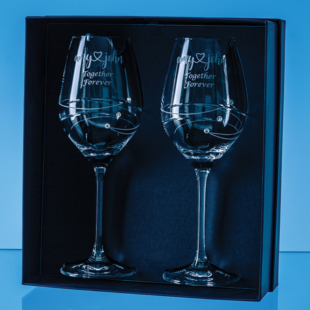 The wine glasses have a spiral design cutting with 3 Swarovski crystals bonded to the side of the glass. There is a large area that can be engraved with any wording, logo or crest to create a personalised gift for any celebration that will be treasured and displayed with pride. The glasses are presented in a gift box.