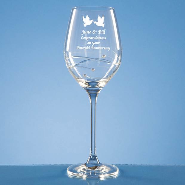This wine glass has a spiral design cutting with 3 Swarovski crystals bonded to the side of the glass. There is a large area that can be engraved with any wording, logo or crest to create a personalised gift for any celebration that will be treasured and displayed with pride.